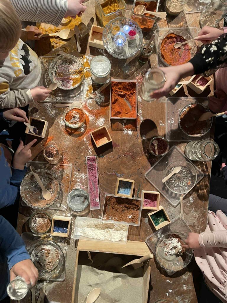 Her blev teatrets fortælling om fantasiens magi til noget, vi kunne mærke med hænderne. Gennem leg, materialer, lys og lyd lod vi publikums egne fingre folde forestillingens univers ud i nye æstetiske spor. Workshoppen kredsede om “det magiske sand”, som i forlængelse af teateroplevelsen fik lov at leve videre – båret af nysgerrighed, nærvær og fælles skaben.