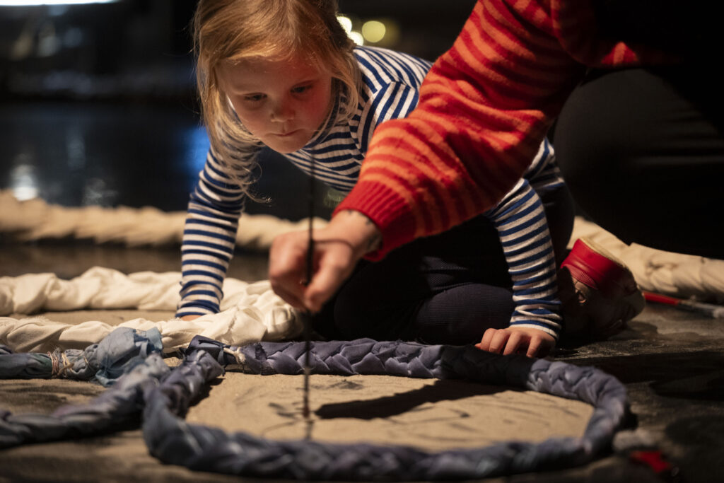 Holstebro Kunstskole deltog med workshoppen Sanseverden i Kreateltet – et særligt iscenesat område, hvor børn og familier kunne gå på opdagelse i en stor tekstilskulptur skabt af genbrugs- og naturmaterialer. Her fik deltagerne mulighed for at mærke, eksperimentere og skabe med en bred vifte af taktile materialer, og mange børn satte deres eget præg på værket og fik plads til at udfolde deres frie kreativitet.