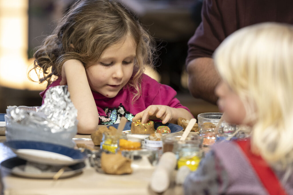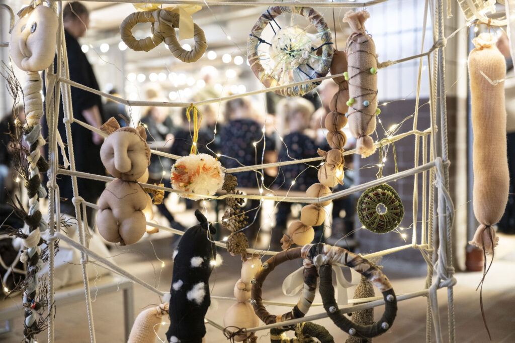 Med inspiration fra barndommens legende skaberglæde – hvor alt kan opstå af ler, sand og hverdagsmaterialer – blev de besøgende inviteret ind i et sanseligt juleværksted. Her kunne man tegne julegaver, forme julelækkerier i ler og skabe små værker med perler og duftende krydderier. Der blev blandt andet lavet trøfler, slik, brunkager og kringler i ler – og workshoppen bød også på tekstile “pølser” og kringler med en intens, karakteristisk duft fra fårepels.